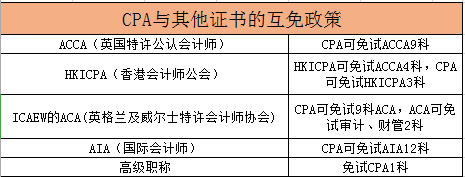 上图是CPA和其他证书的互免政策,可以看出CPA可以免试ACCA的9门科目,HKICPA的3门科目,还有aca的9门科目,以及AIA的12门科目,可见CPA的证书优势非常大。